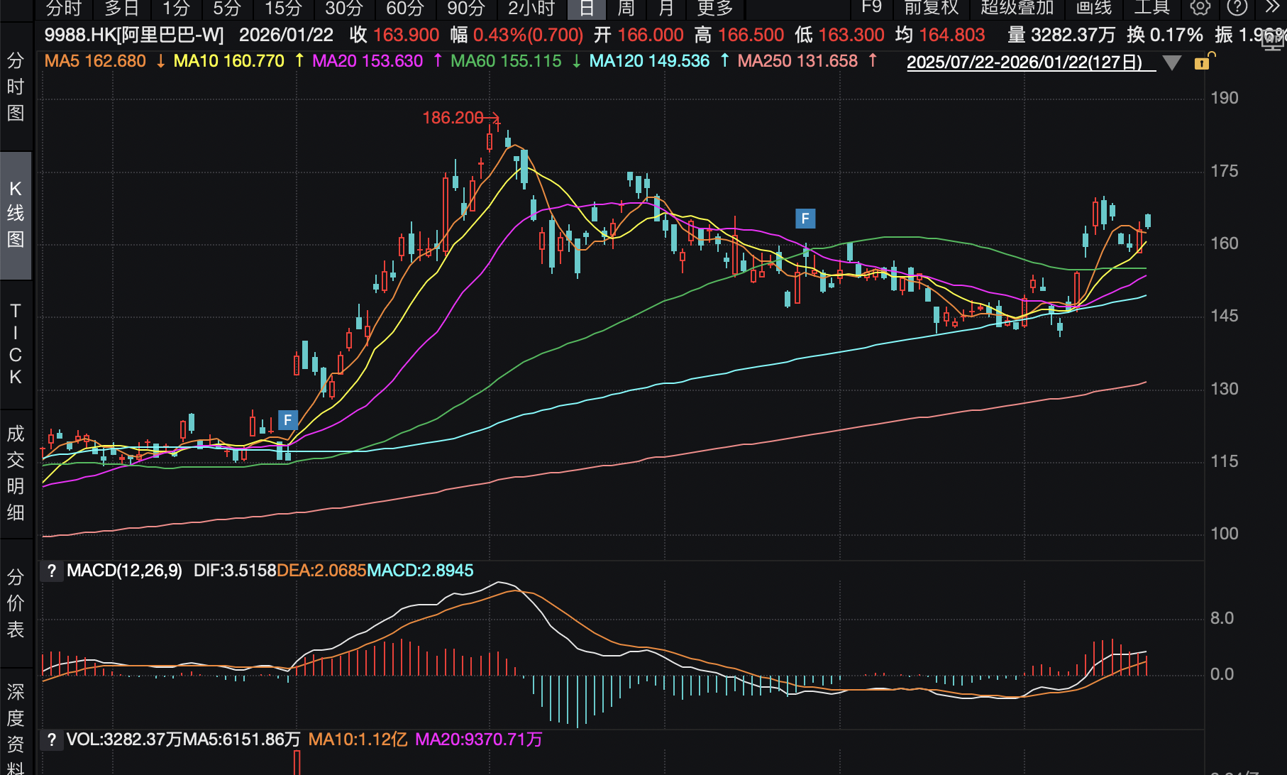 根据香港交易所披露的数据,摩根大通对阿里巴巴集团控股有限公司 - W的多头持仓比例于2026年1月15日从7.99%增至8.03%,花旗集团对阿里巴巴集团控股有限公司 - W的多头持仓比例于2026年1月14日从6.03%降至5.38%。