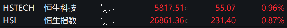 恒生指数高开0.87%,恒生科技指数涨0.96%。泡泡玛特涨逾4%,阿里巴巴涨逾3%,京东集团、阿里健康涨逾2%。