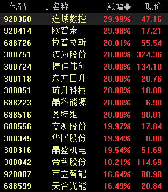 具体来看,光伏板块全天强势,连城数控、欧普泰30%涨停,拉普拉斯、迈为股份、东方日升等近10股20%涨停,晶科能源、隆基绿能、高测股份午后涨停,酉立智能、天合光能等纷纷大涨。
