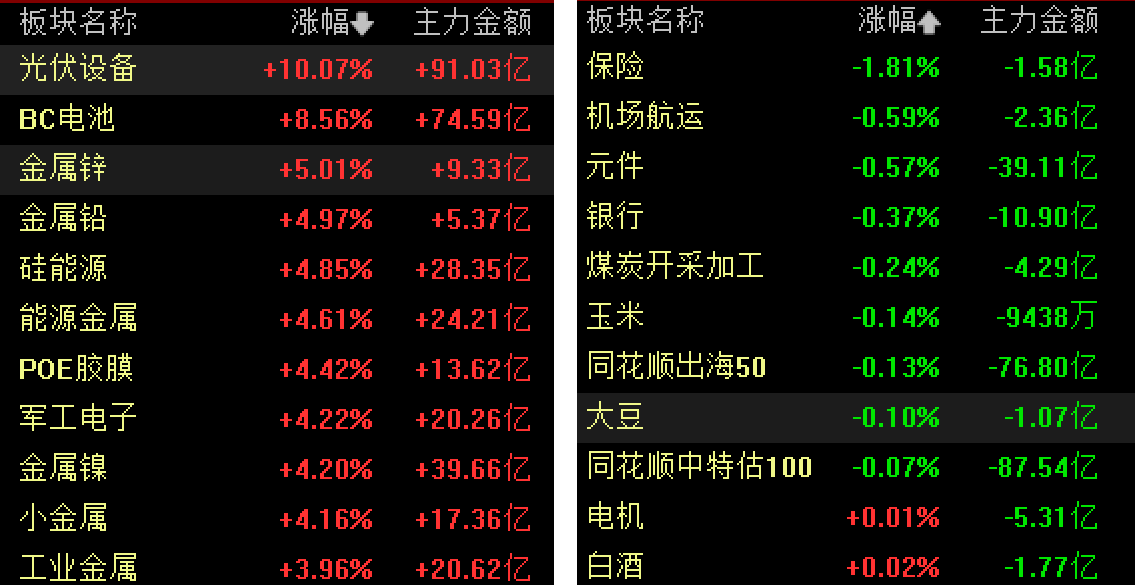 盘面上,光伏产业链爆发,太空光伏方向领涨;商业航天概念再度大涨,基本金属、贵金属携手走强,AI应用题材局部活跃。算力硬件产业链回调,CPO、存储器方向领跌。