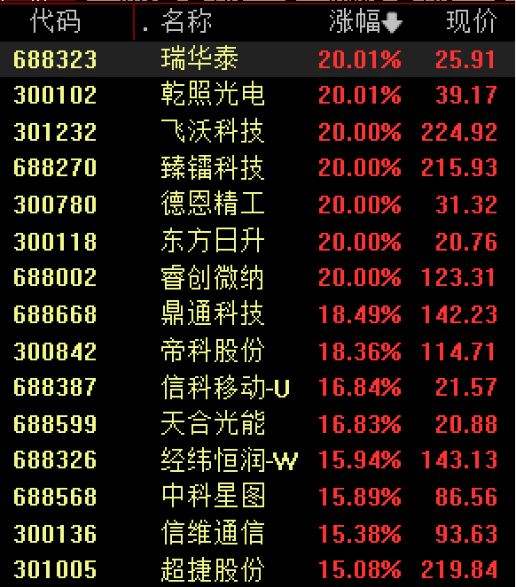 商业航天概念再度活跃,瑞华泰、德恩精工、乾照光电、飞沃科技、睿创微纳等多股20%涨停,润贝航科、西部材料、金风科技、中国卫星等超20股涨停。