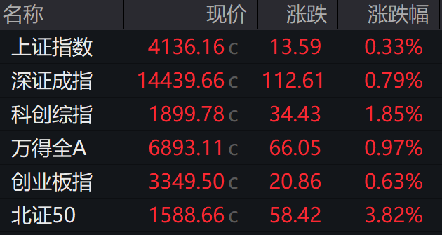 上证指数报收4136.16点,涨0.33%;深成指报收14439.66点,涨0.79%;创业板指报收3349.5点,涨0.63%;科创综指报1899.78点,涨1.85%。
