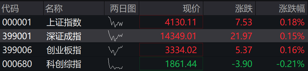 上证指数报4133.58点,涨0.27%;深成指报14360.98点,涨0.24%;创业板指报3322.96点,跌0.17%;科创综指报1879.53点,涨0.76%。