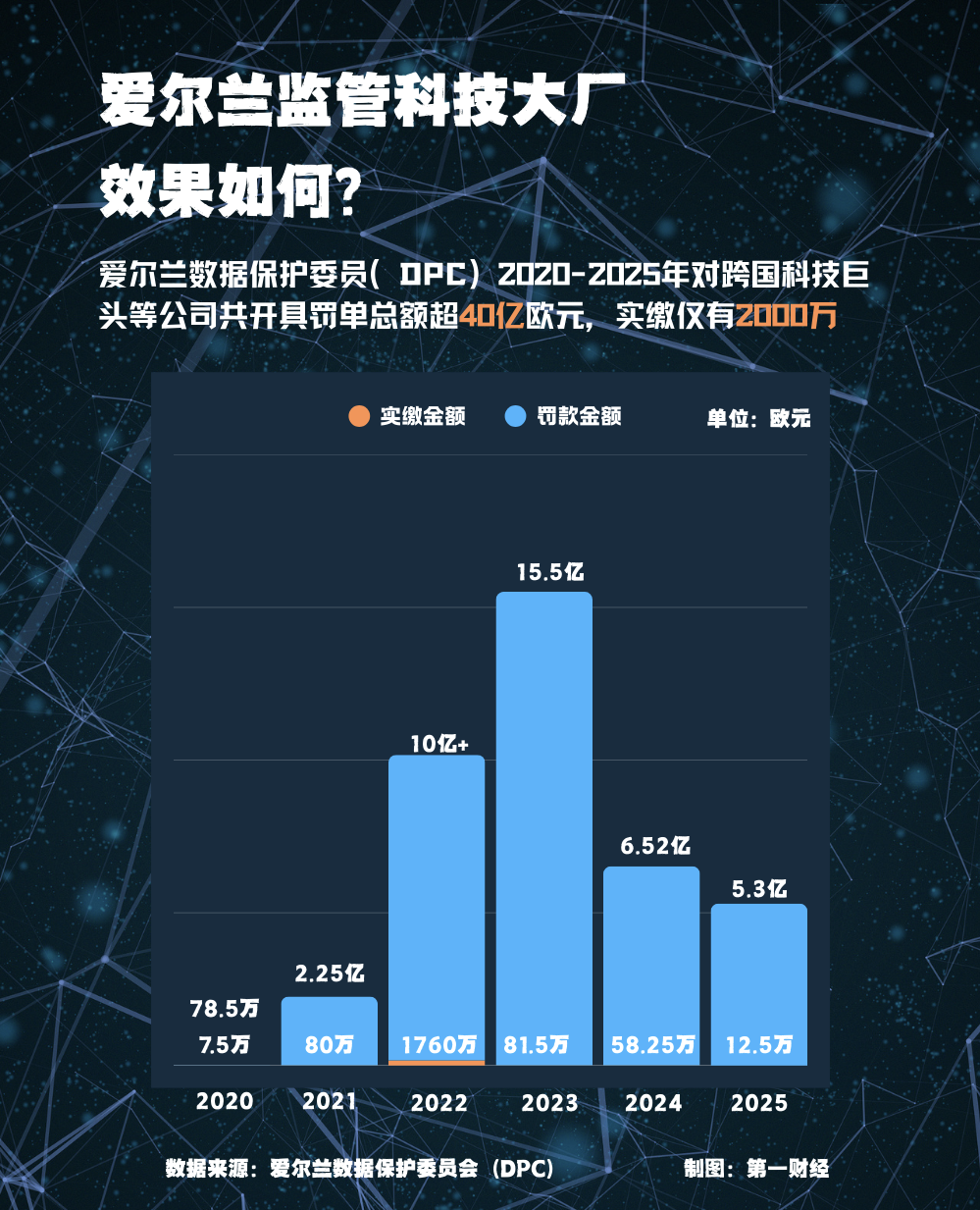 过去几年,爱尔兰监管机构给跨国科技大厂开出几十张罚单,罚金却迟迟未能兑现。第一财经记者查询爱尔兰数据保护委员会(DPC)年报发现,2020年至2025年间,DPC对跨国科技公司共开出超40亿欧元的巨额罚款,但仅有2000万欧元落袋。DPC表示,这些案件大多正在爱尔兰法院上诉审理。