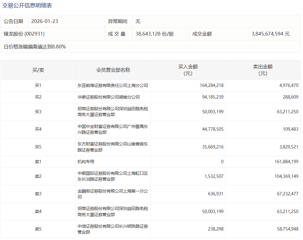 锋龙股份今日涨停,成交额38.46亿元,换手率19.20%。盘后龙虎榜数据显示,有1家机构专用席位净卖出1.62亿元。