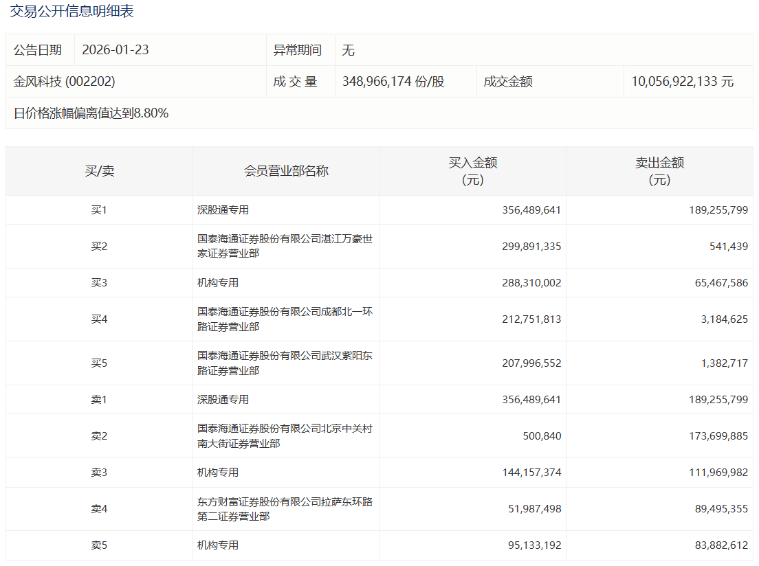 金风科技今日涨停,成交额100.57亿元,换手率10.37%。盘后龙虎榜数据显示,深股通专用席位买入3.56亿元并卖出1.89亿元,3家机构专用席位净买入2.66亿元。