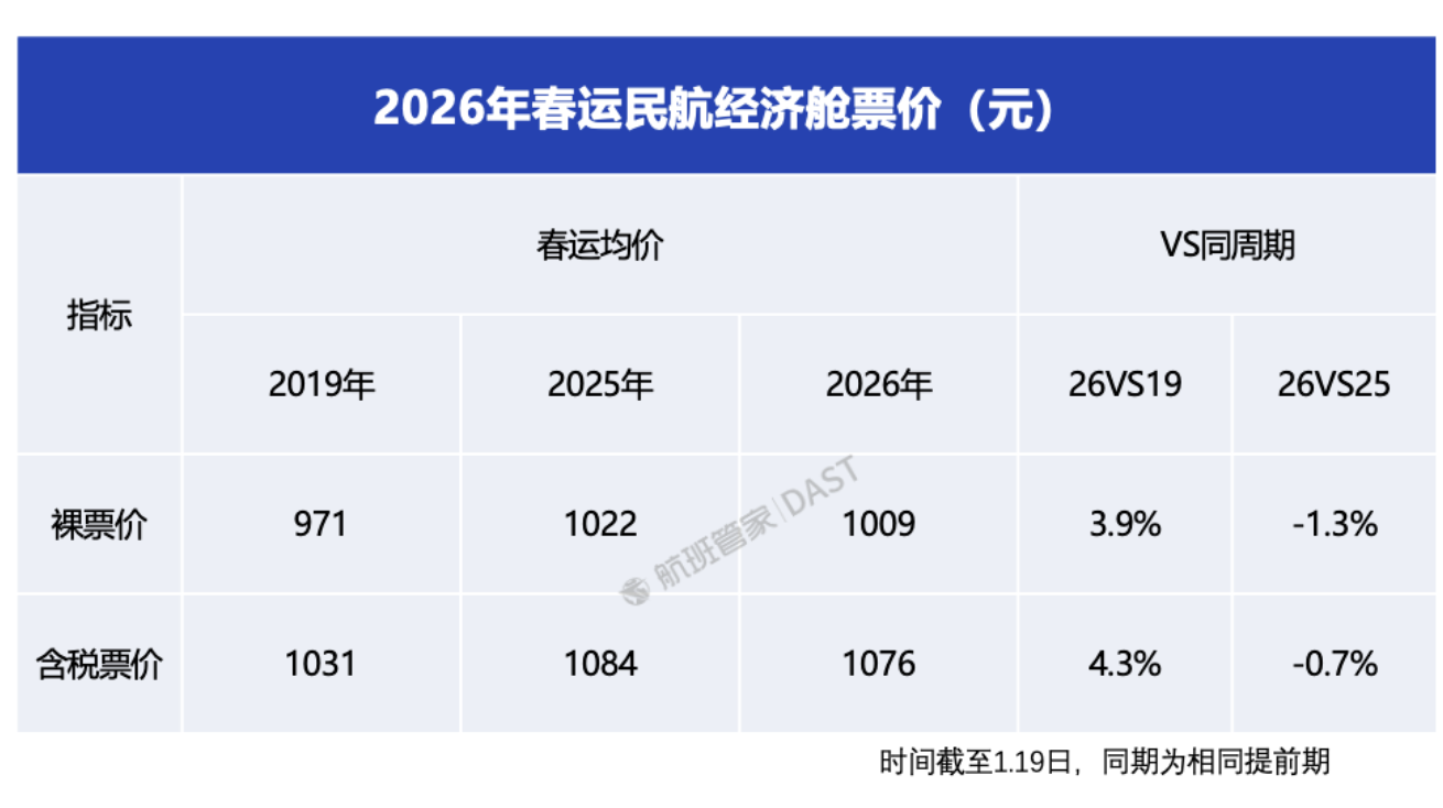 从航班管家目前的监测数据来看,2026年春运期间的整体票价水平与2025年春运提前预订期持平,但较2025年春运实际成交价高出20%。与此同时,2026年春运国内经济舱预售票价是逐渐提升的趋势,比如1月15日时的平均经济舱票价为1064元(含税),1月19日则为1084元,同比2025年下降0.7%,同比疫情前的2019年则提高4.3%。
