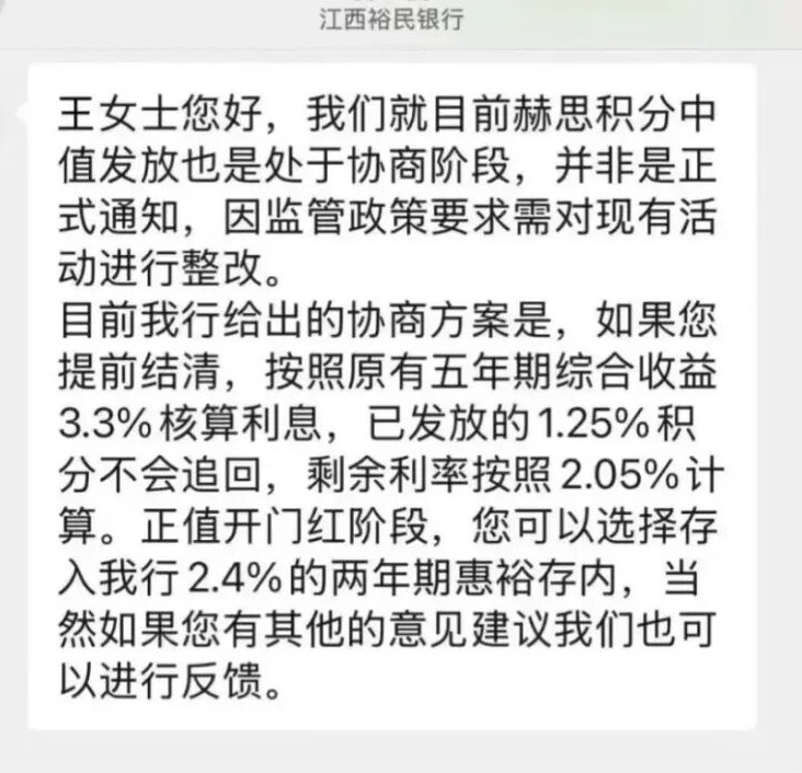 1月24日以来,一张显示为江西裕民银行某客户经理的微信截图在各大存款群流传。根据图片信息,裕民银行正在考虑停止发放存量存款积分,并给出了协商方案,征求储户建议。不过,上述方案引发了储户的不满。
