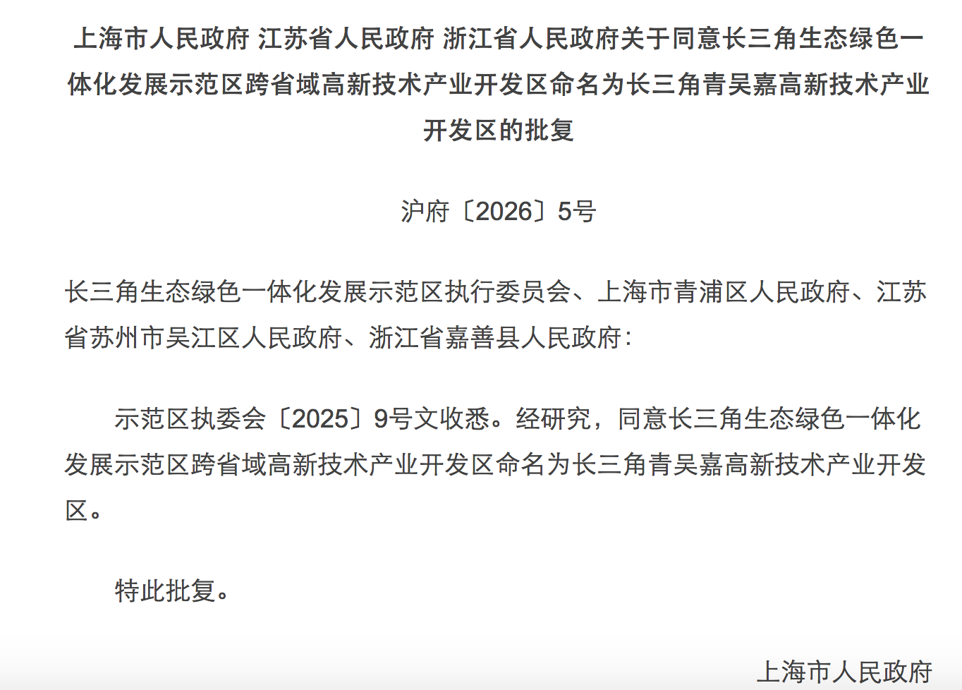 《文件》显示,长三角生态绿色一体化发展示范区执行委员会、上海市青浦区人民政府、江苏省苏州市吴江区人民政府、浙江省嘉善县人民政府:经研究,同意长三角生态绿色一体化发展示范区跨省域高新技术产业开发区命名为长三角青吴嘉高新技术产业开发区。