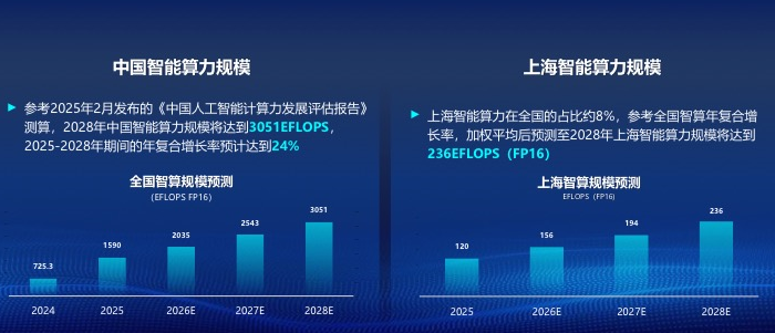 杨炼介绍,数据显示,2025年智能算力占全球算力比重超过70%,预计2030年占比将超过90%,年复合增速保持30%以上。上海智能算力在全国的占比约8%,参考全国智算年复合增长率,加权平均后预测,至2028年上海智能算力规模将达到236EFLOPS(FP16)。