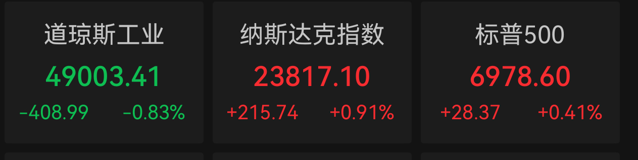 截至收盘,道琼斯指数下跌408.99点,跌幅0.83%,报49003.41点;标普500指数上涨28.37点,涨幅0.41%,报6978.60点;纳斯达克综合指数上涨215.74点,涨幅0.91%,报23817.10点。