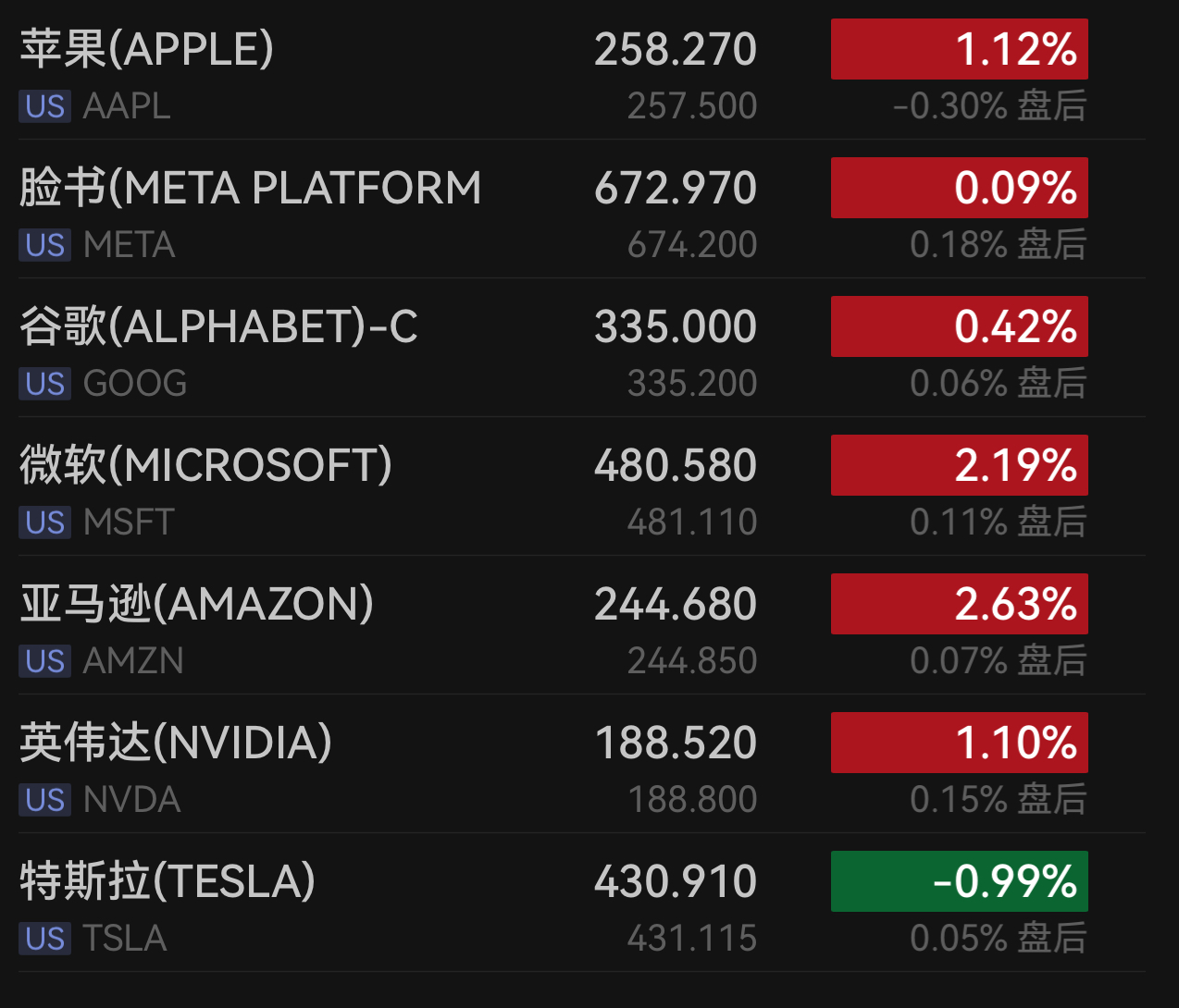 科技板块继续领涨。英伟达涨1.10%,微软涨2.19%,苹果涨1.12%,亚马逊涨2.63%,Meta涨0.09%,博通涨2.44%,谷歌涨0.42%,超威半导体涨0.29%。特斯拉跌0.99%。
