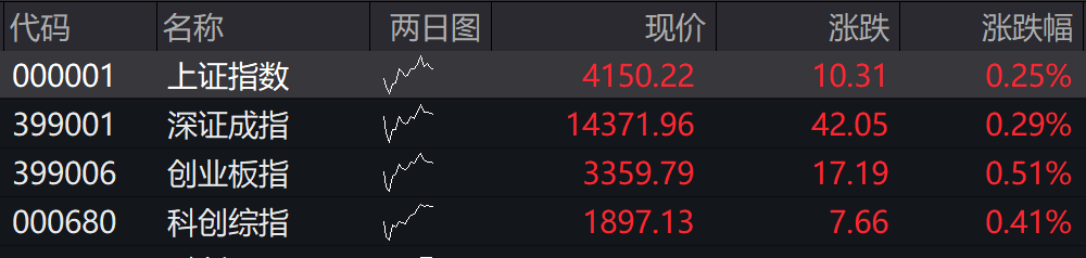 沪指高开0.25%,深成指高开0.29%,创业板指高开0.51%,科创综指高开0.41%。