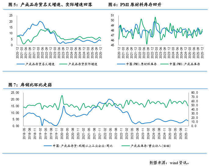 12月末,工业企业产成品存货名义增速回落0.7个百分点至3.9%,库销比回落9.2个百分点至48.6%。库销比走弱叠加库存增速回落,表明在销售改善带动下库存压力有所缓解,需求边际修复迹象显现,但持续性仍有待进一步观察。
