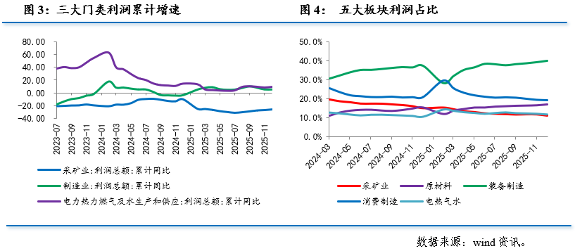 1~12月,制造业利润总额同比增长5%,与1~11月持平。三要素中,增加值累计增速为6.4%,与1~11月持平;营业收入利润率同比增长1.5%,较1~11月回落0.3个百分点;制造业PPI多数改善,上游原材料制造业价格稳步回升;中游装备制造业价格多数回升,下游制造业价格涨跌互现。价格改善对冲了利润率边际回落的拖累,制造业利润延续正增长态势。