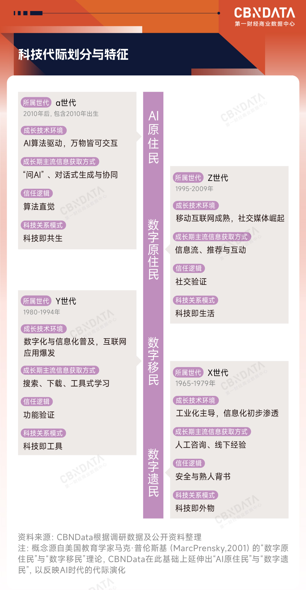 在此共性框架下,不同群体对科技的价值认知呈现显著差异,有人视科技为能力延伸,也有人觉得它打扰生活。这种分化首先源于科技代际差异。受成长过程中的成长技术环境(PC-移动互联网-推荐算法-AI共创)、获取信息入口(搜索框-APP入口-推荐流-对话式/Agent)等因素影响,不同代际的人在学习成本、信息处理与操作习惯等维度具明显差异。