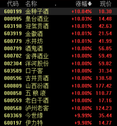 具体来看,白酒板块午后爆发,泸州老窖、水井坊、舍得酒业、皇台酒业、酒鬼酒等近20股涨停。