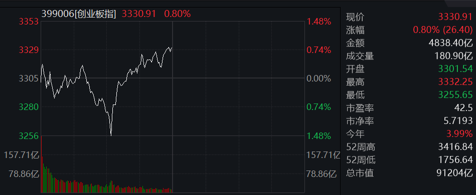 11:05 创业板指快速翻红,CPO概念股领涨,联特科技涨逾10%,天孚通信涨逾8%,德科立涨、仕佳光子涨逾6%。