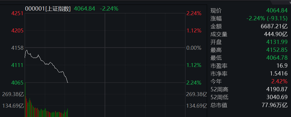 10:34 上证指数跌逾2%,创业板指跌逾1%。贵金属、基本金属、石油化工、房地产板块跌幅靠前。