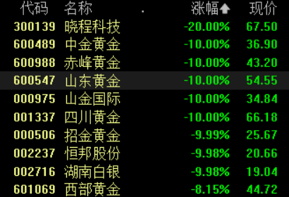 贵金属板块集体大跌,中金黄金、四川黄金、赤峰黄金等多股跌停。