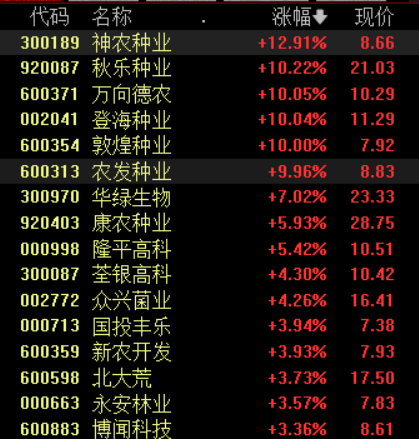 具体来看,农业股盘中拉升,敦煌种业、登海种业等多股涨停。