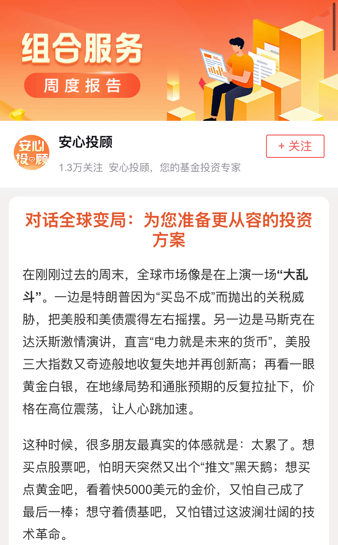 晚上八点,刚加完班的老陈靠在沙发上,习惯性地点开了平安证券APP。他没有去追踪自选股的盘中波动,而是点开了“安心投顾”刚刚推送的周报。周报像一位见多识广的伙伴,和他聊起了这个周末全球市场的全景:从紧张的地缘政治,再到黄金高位的博弈,周报知无不言,并坦言,这种时候投资者感到疲惫是再正常不过的心态。但报告并未停留在描述焦虑,它指明了清晰的方向,并温和地给老陈总结。关掉报告,老陈觉得刚刚盘踞在心头的无形担忧,似乎被这份清晰、平稳的框架化解了许多。