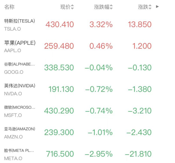 明星科技股跌多涨少,特斯拉涨3.32%,谷歌跌0.04%,英伟达跌0.72%,微软跌0.74%,亚马逊跌1.01%,甲骨文跌2.62%,Meta跌2.95%。