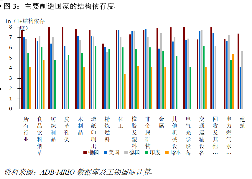 从行业层面看,结构依存度的分布清晰揭示了中国对全球供应链中游环节的实质性掌控。在制造业的14个细分行业中,中国在绝大多数行业的结构依存度都高居全球榜首,尤以纺织、皮革、金属及电气光学设备等行业最为突出。即便化工、精炼燃料等在美国是主要出口中心的行业,中国在结构方面仍占据路径优势。这种规模与路径的错位说明,美国输出的增加值往往需要通过中国这一枢纽进行转化或集散,方能触达全球终端。在电气设备、机械制造等高复杂度行业,中国极高的结构依存度一定程度上回应了产能转移的争议。印度等新兴经济体虽然在出口规模上有所提升,但在网络路径掌控力上仍与中国存在数量级差距,更多是扮演分支节点的角色。在这一意义上,相较于其他中心度指标主要反映横向连接程度,结构依存度更能体现一个经济体对纵向价值链关键环节的把控能力。
