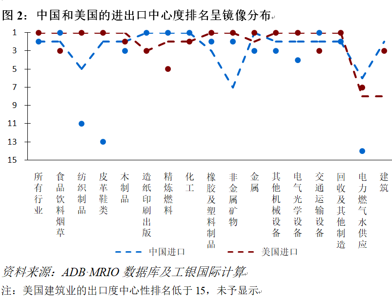当视角进一步下沉至行业层面,这种错位分工表现得更加直观。多数制造业中,中国的出口中心度与美国的进口中心度呈现出高度一致的变化方向,显示出近乎镜像的结构特征。在纺织皮革、橡胶塑料、电气光学设备、非金属矿物等行业,中国在出口端显著领先,其增加值输出在网络中占据关键节点位置。美国在这些领域依赖外部供给,表现为进口中心度较高。相比之下,美国出口中心度与中国进口中心度之间的相关性明显偏弱,反映出中国的进口结构更具分散性与全球化特征。