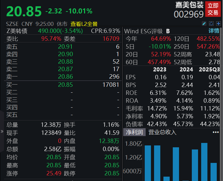 嘉美包装复牌跌停,此前涨幅达408.11%。