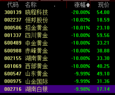 09:26 黄金、有色金属板块大面积跌停,湖南黄金、晓程科技、西部黄金、四川黄金等多股跌停。消息面上,受获利回吐和短期期货交易者多头平仓等因素影响,国际黄金和白银价格1月30日继续大幅下跌,均创下数十年来最大单日跌幅。