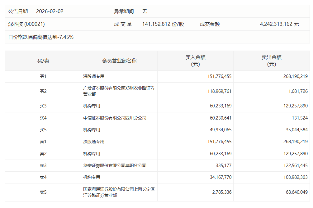 深科技今日跌停,有2家机构专用席位净卖出1.39亿元