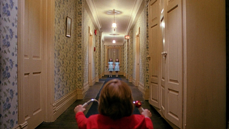 《闪灵》的拍摄使用了诸多电影新技术。影片开场的航拍镜头如飞鸟般掠过湖泊与群山,温柔又诡异地将观众引向那座即将吞噬一切的奢华酒店。它是最早使用斯坦尼康(Steadicam:摄影机稳定器)的电影之一,丹尼骑着儿童三轮车在酒店走廊穿行的跟拍镜头,创造出前所未有的流畅感与压迫性。在影片中,库布里克展示出对空间的调度能力,酒店空旷而压抑,走廊漫长而对称,空旷与幽闭共同制造出强烈的不安感,令观众与角色一同感到窒息。
