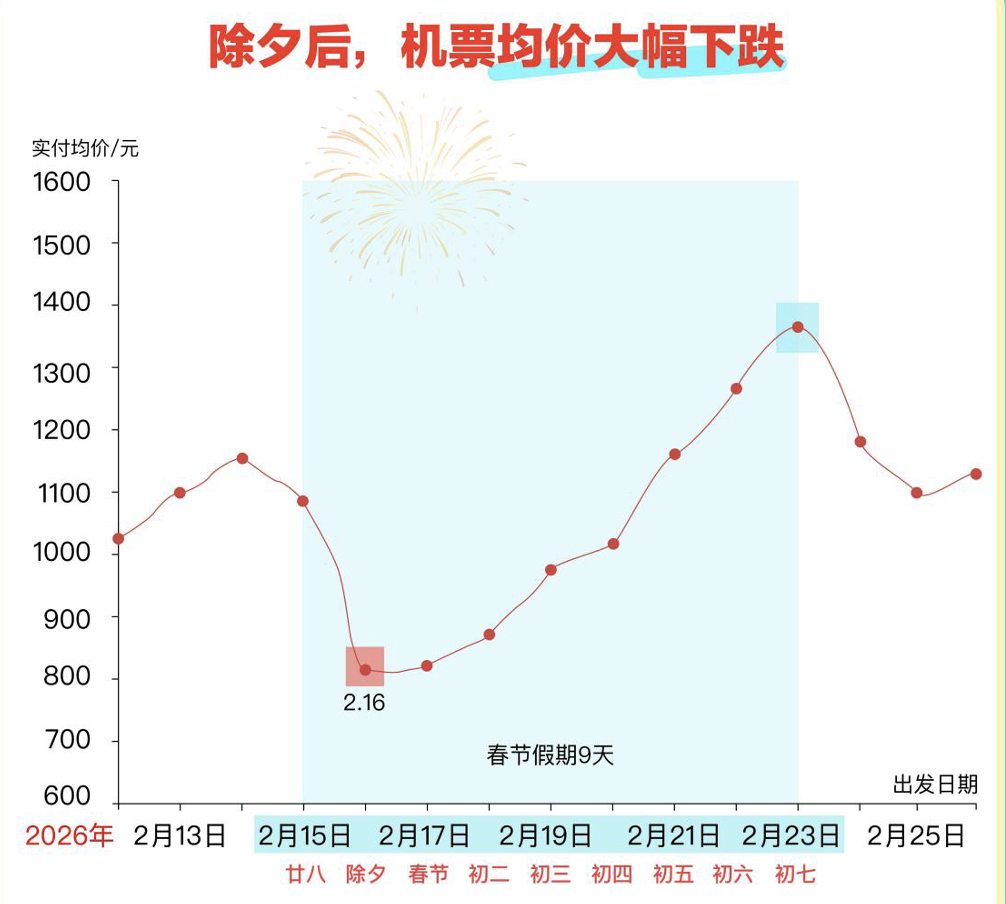 而机票价格也与出行量成正比:到2月15日春节假期第一天,机票价格开始回落,2月16日降至节日期间最低点,17日-19日机票价格都相对划算。