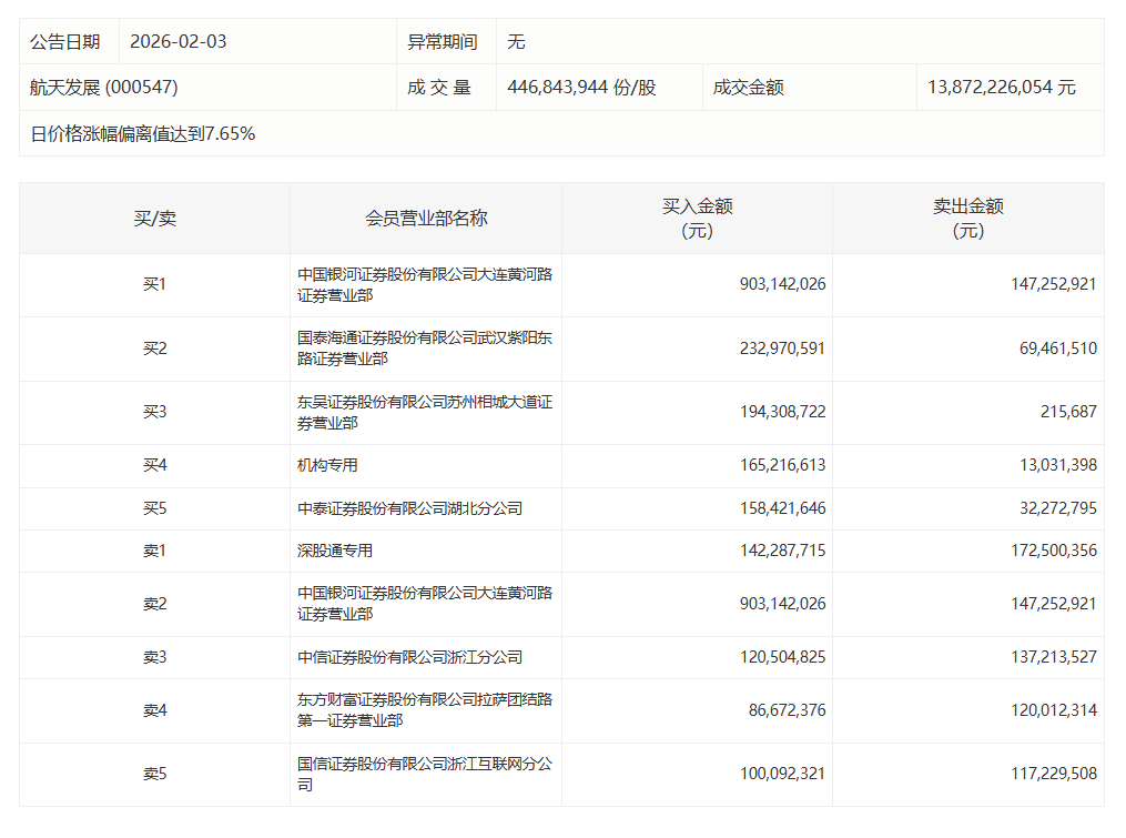 航天发展今日涨停,中国银河证券大连黄河路证券营业部净买入7.56亿元