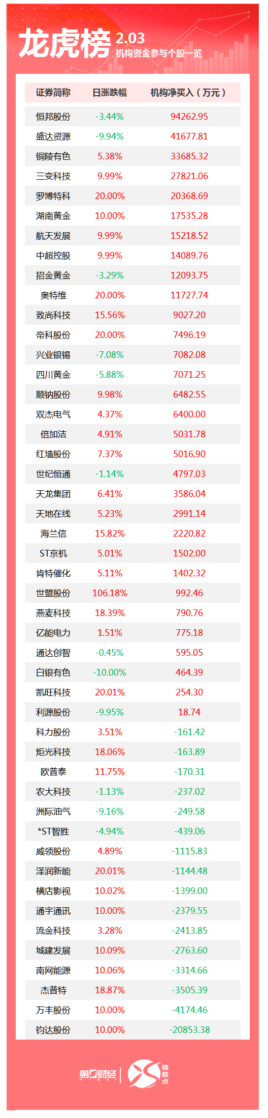 当天机构净买入前三的股票分别是恒邦股份、盛达资源、铜陵有色,净买入金额分别是9.43亿元、4.17亿元、3.37亿元。