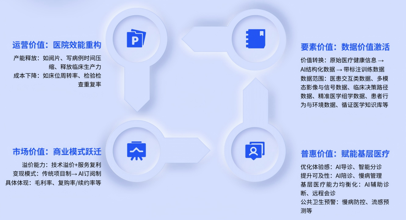 人工智能技术已不再是单一环节的辅助工具,而是深度渗透医疗健康产业全链条,从运营、市场、要素、普惠四个核心维度重构产业价值。这一价值重构不仅推动医疗机构效能提升、企业商业模式升级,更激活了数据要素潜力,让优质医疗资源触达更广泛人群,为产业高质量发展注入核心动力。