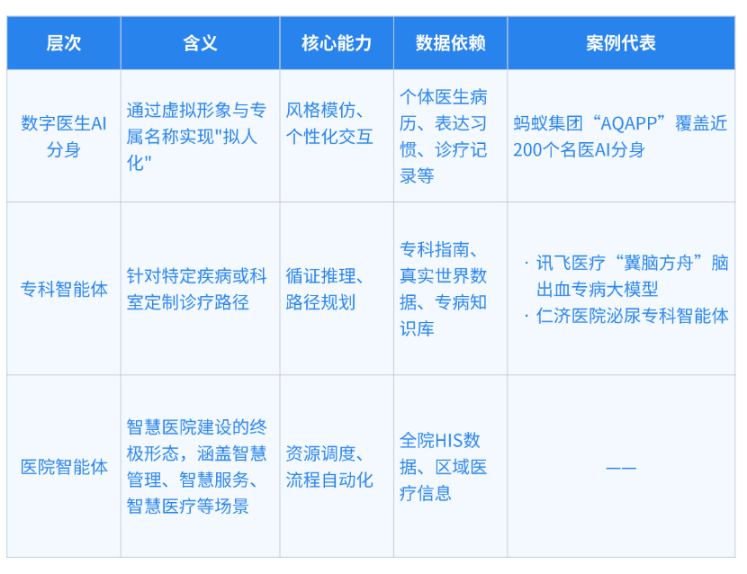 数字分身已率先规模化→专科智能体处于验证期→医院智能体仍在概念中