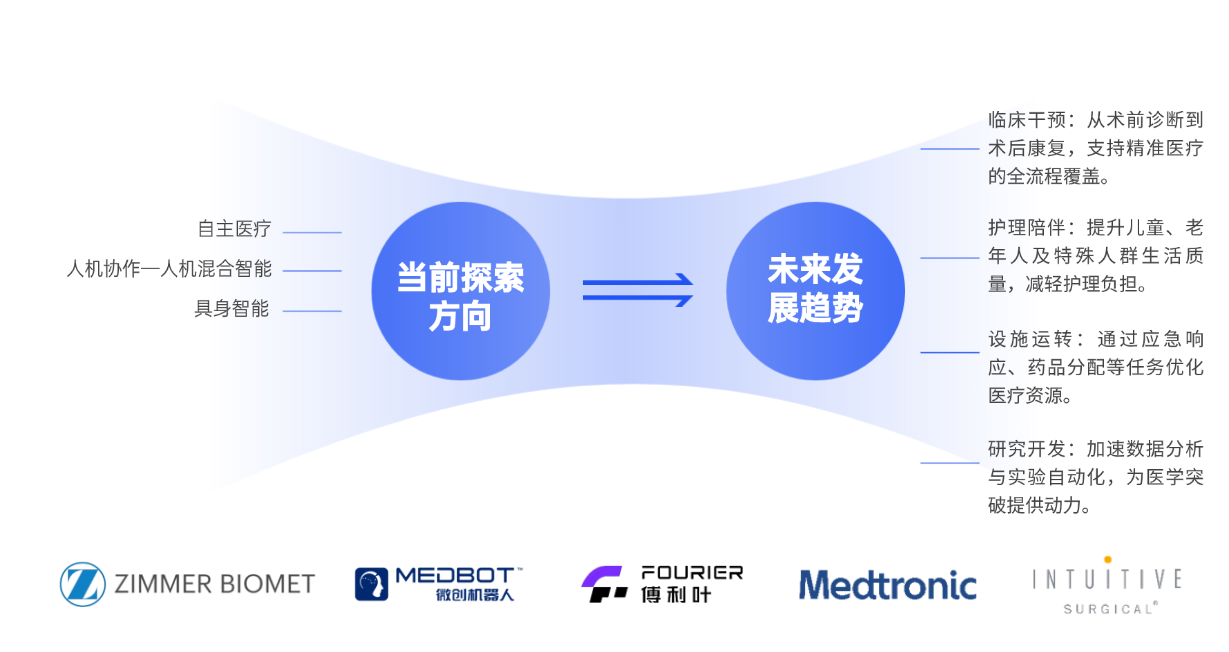 具身智能以机器人、机械臂等物理载体为核心,融合多模态感知、运动控制与AI决策技术,实现了人工智能从“数字虚拟服务”到“物理实体干预”的关键跨越。当前,行业正围绕“自主医疗、人机协作、具身智能深化”三大方向探索实践,未来将聚焦临床干预、护理陪伴、设施运转、研究开发四大场景全面落地,成为链接数字医疗与物理健康服务的核心桥梁。