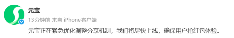 元宝官博发文称,正在紧急优化调整分享机制,将尽快上线,确保用户抢红包体验。此前微信发布公告称,对元宝的违规链接进行处置,限制其在微信内直接打开。