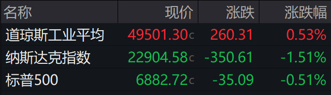 ►►当地时间周三,美股三大股指分化,截至收盘,道指涨0.53%,纳指跌1.51%,标普500指数跌0.51%。