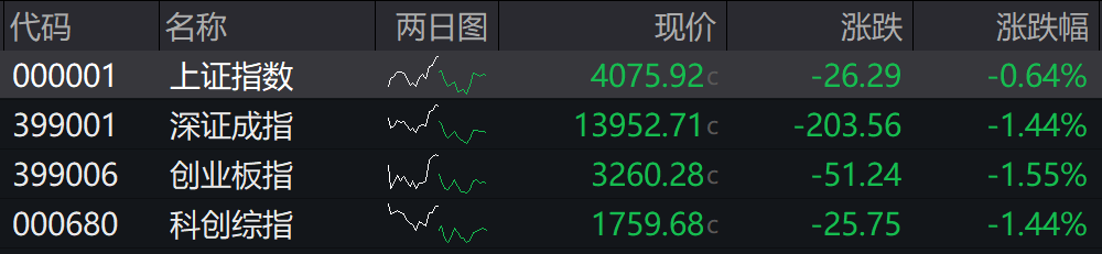 截至收盘,沪指跌0.64%,深成指跌1.44%,创业板指跌1.55%,科创综指跌1.44%。