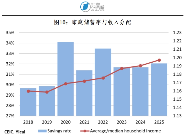 值得注意的是,2025年储蓄率有所上升,并且远高于疫情前的水平。家庭储蓄意愿增强,可能反映出他们对经济前景依然保持谨慎态度。这也可能是房地产市场下行带来的连带影响。此外,还可能反映了收入分配状况的恶化。图10绘制了家庭平均收入与中位收入的比率与家庭储蓄率之间的关系。当平均收入相对于中位收入上升时,收入分配变得越来越不平等,更多的收入流向富裕家庭。由于高收入家庭通常储蓄更多,因此这种收入分配的不平衡可能解释了一部分储蓄率上升的趋势。