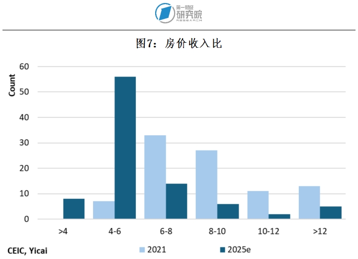 房地产市场调整使得房价变得更容易承受。纵观91个城市,中位房价与家庭收入的比率从2021年的8.6下降到2025年的5.3(见图7)。虽然仍有7个中国城市的房价与家庭收入比超过10,但这一数字较2021年的24个城市已显著减少。