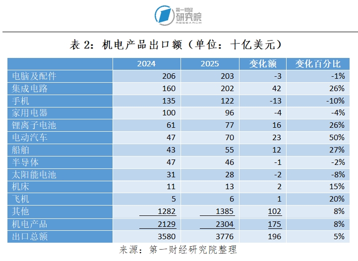 此外,中国出口的产品结构不断变化。凭借强大的制造能力,中国的出口能够灵活应对不断变化的需求。例如,2025年,消费品(如手机、电脑和家用电器)的需求疲软,这些产品的销量下降(见表2)。但生产资料(如集成电路和锂离子电池)的需求则十分强劲。此外,电动汽车和船舶的出口也迅速增长。