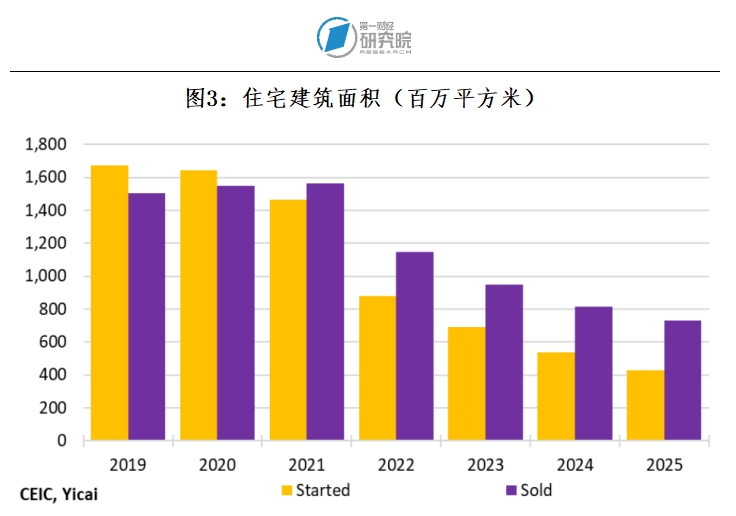 房地产市场的调整尚未出现触底迹象。2025年,住宅销售面积下降了10%,仅为7.33亿平方米。这还不到2019—2021年平均销售面积的一半(见图3)。而新开工面积的调整更为剧烈,同比下降了20%。2025年新开工面积为4.3亿平方米,仅为2019—2021年平均水平的27%。