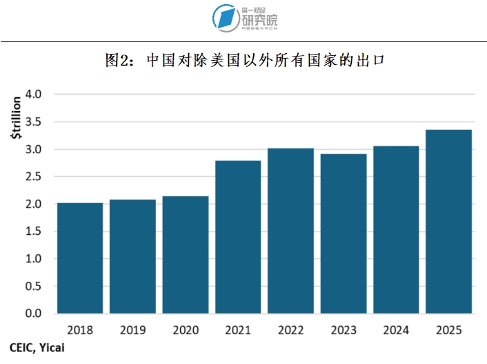 除了美国以外,其他国家对中国商品的需求似乎还没有达到饱和。2025年,中国对这些国家的出口增速达到了10%(见图2)。
