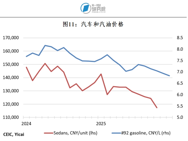 还应强调的是,零售销售是以名义金额计量的,当价格波动较大时,它们会曲解消费的真实情况。表3显示,2025年汽车和石油这两个重要消费类别的零售销售下降。但这一下降似乎完全是由于价格下跌所致(见图11)。经过价格调整后,汽车和石油的消费可能分别增长了6%和1%。
