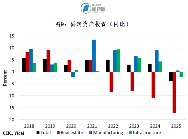 房地产市场疲软是固定资产投资下降的主要原因。房地产投资已连续第四年下滑,且2025年降幅最大(见图9)。
