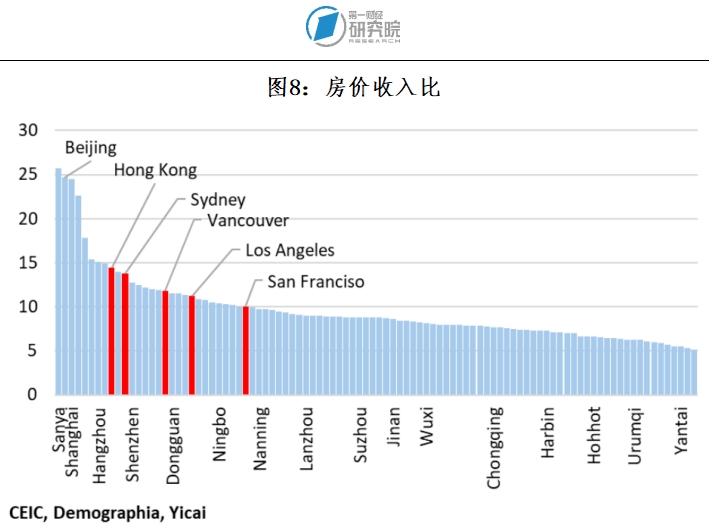 有8个中国城市的房价收入比超过了以高房价著称的中国香港(见图8)。在91个中国城市中,有24个城市的房价收入比高于旧金山。